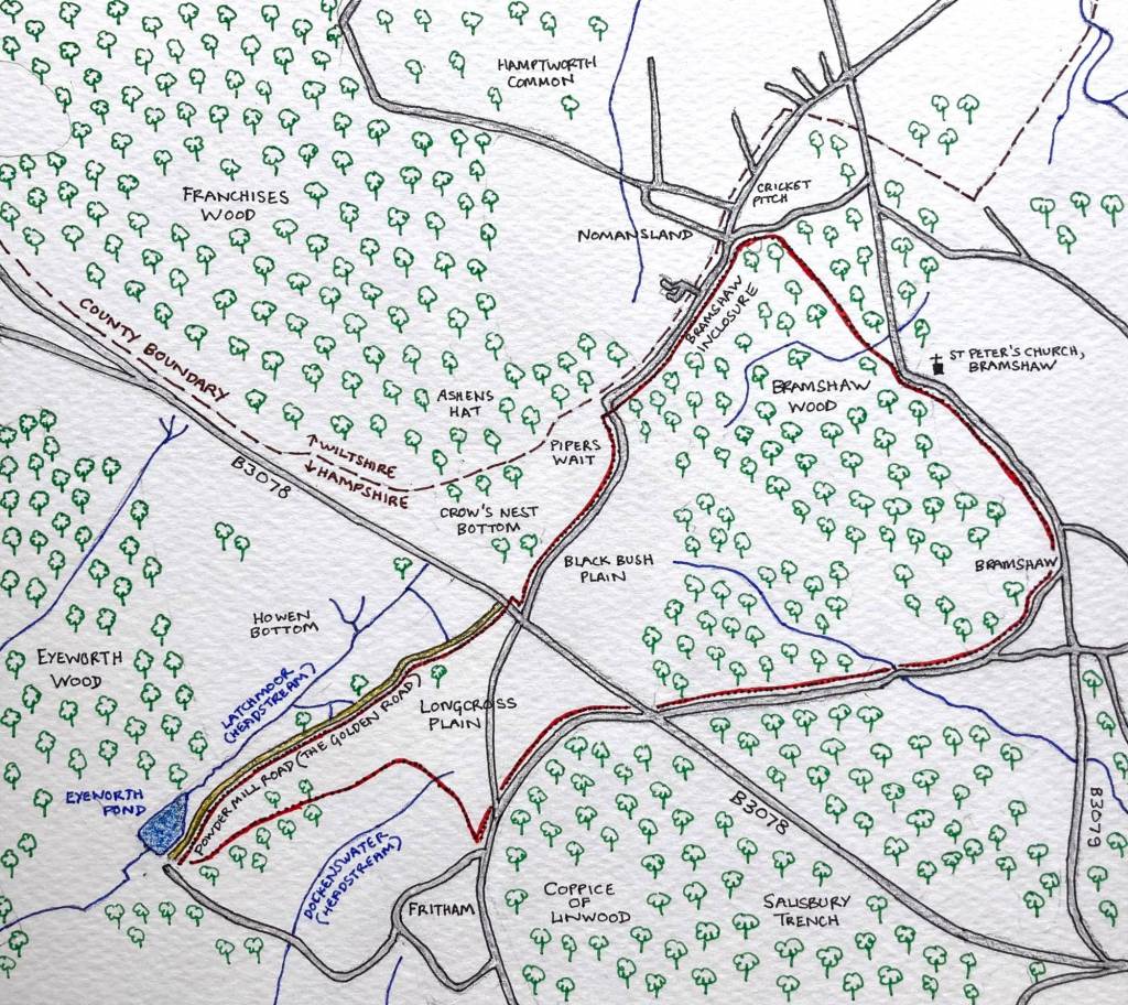 We head off along the bending road and down the hill to Nomansland, passing under the western eaves of Bramshaw Inclosure as we go. The village lies on the cusp of the boundary between two counties: to the left of the road is Wiltshire, while Bramshaw Inclosure and the village green, to the right of the road, are in Hampshire (this boundary is unchanged since before Joan’s time). There’s an interesting article on the Wiltshire and Swindon History Centre website about how Nomansland (originally No Man’s Land) was established, and the meaning of its name. In brief, it is not the only Nomansland in the country; similar placenames exist elsewhere, originally associated with scrub or unused/unusable land, often next to boundaries. In the case of our Nomansland, which officially dates back to 1802, it appears there had been some earlier illegal encroachment of land from the Crown.