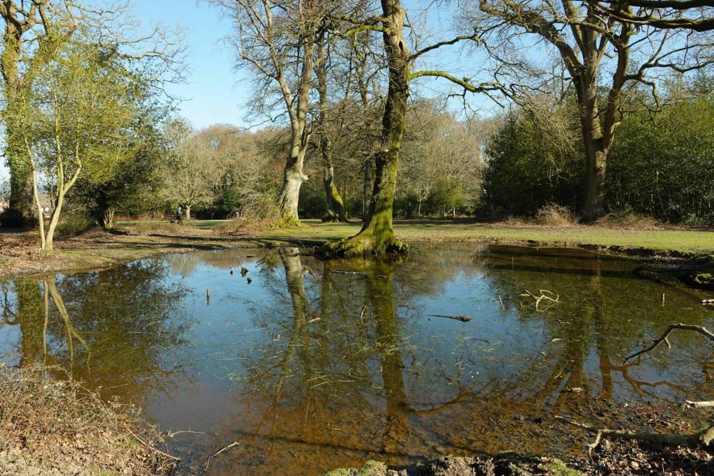 We begin at Eyeworth on a bright but cold early morning in late February, on which frost glints on the grass and pinches my fingertips. The Pond looks as if it has sat there between the trees forever, a timeless haven out of an Arthurian tale, its little islands and reedbeds home to mist and mysteries. A goose glides serenely across the water through golden reflections of the oaks and beeches of ancient Eyeworth Wood, gilded with the morning sunlight.
