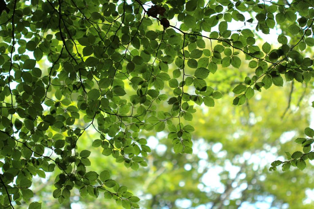 Continuing on, we cross the road that cuts through the wood north to south. This road feels like it should be a modern addition because it is so very straight, but it’s been there a long time, appearing on older maps. I call it ‘the road of graceful beeches’, even though there are also other tree species – oaks, sweet chestnut, conifers – crowding along its edges. It’s the way, though, that beeches hang their branches high above the road in shimmering curtains of laced green. When backlit on a sunny day, the effect is magical as your eye follows the straight road’s narrowing perspective, whether the beech leaves are the delicate green of spring, the deep green of summer, or the russet of autumn.