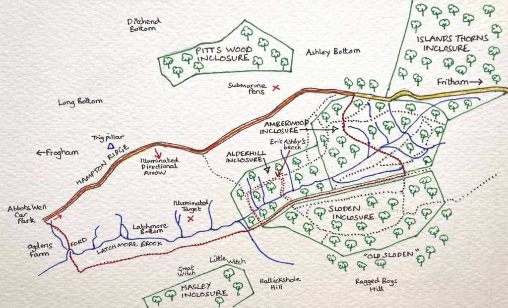 We will leave musings on magic, fairies and liminal ‘thin’ places behind, and take a few steps aside from the walk Joan describes in Walking in the New Forest to venture into Alderhill (this detour is shown as a dotted red line on the sketch map above). I’m off to visit one of my favourite quiet places in the New Forest: the bench erected in memory of the naturalist Eric Ashby.