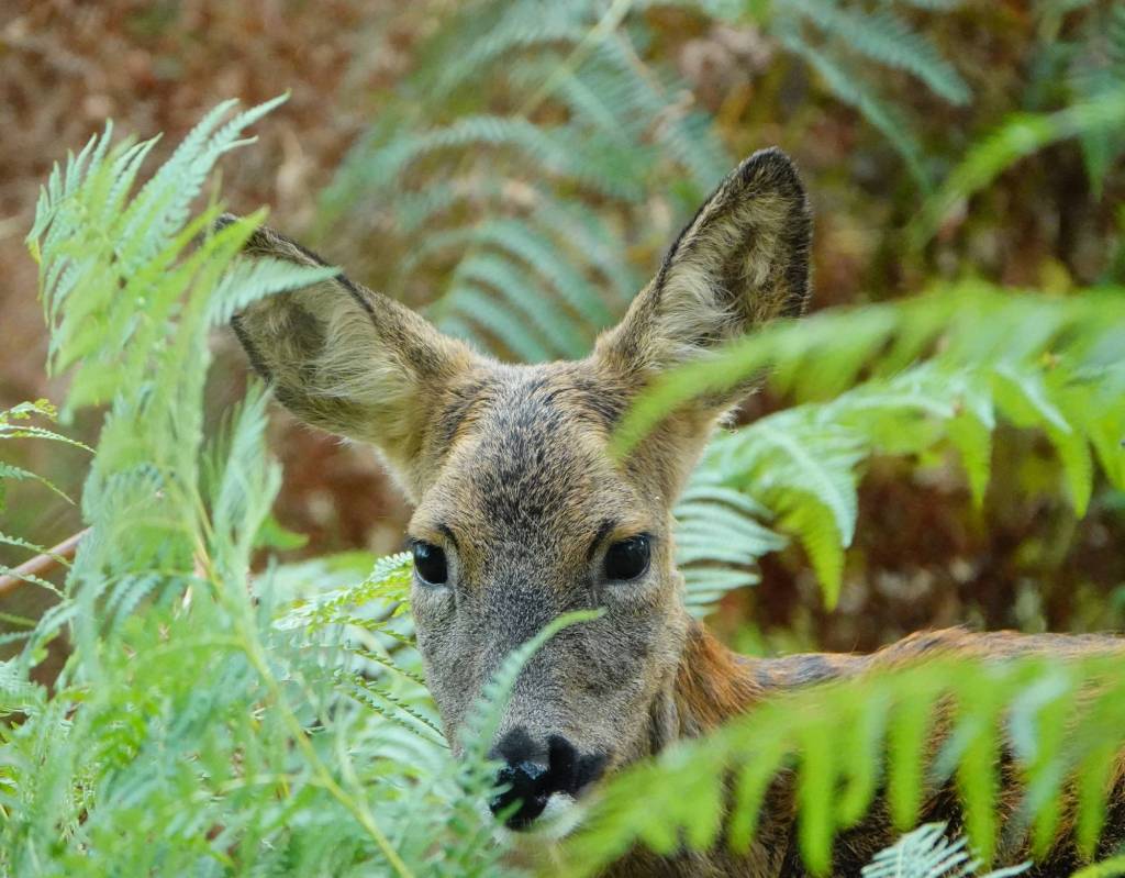 Then, a little later and back on the main track, out from between the thin pillar shapes of the trees, a Roe deer – a dainty doe – sprang from the shadows and onto the gravel path just ahead. She paused, gave me a look, and then leaped into a large patch of ferns and thorns nearby, where she started to browse. While keeping a careful eye on me, she quite clearly felt herself in no danger, and went on feasting while I watched her from a respectful distance, completely enchanted by her clear-faced features, delicate movements, and rust-coloured coat already turning to winter grey, and then took some photographs. I was as quiet as possible, but she lifted her head at every small noise, though not in any real alarm: she was just checking, and went straight back to eating. Nonetheless, so as not to disturb her too much, I said farewell after a few all-too-short minutes and walked on, feeling much happier than before we’d met.