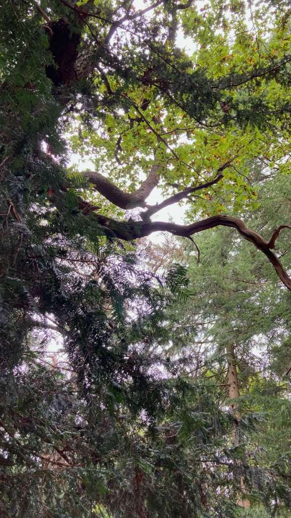 I stood under the Eagle Oak for almost half an hour, appreciating its quiet strength. Noone else passed by. This oak is not a tourist attraction. Less showy than the Knightwood Oak, it inhabits a peaceful corner. I’m not sure how old it is reputed to be, but it would have started its life long before the Knightwood Plantation was established around about it. It will almost certainly outlive the plantation’s tall, thin, straight pines.
