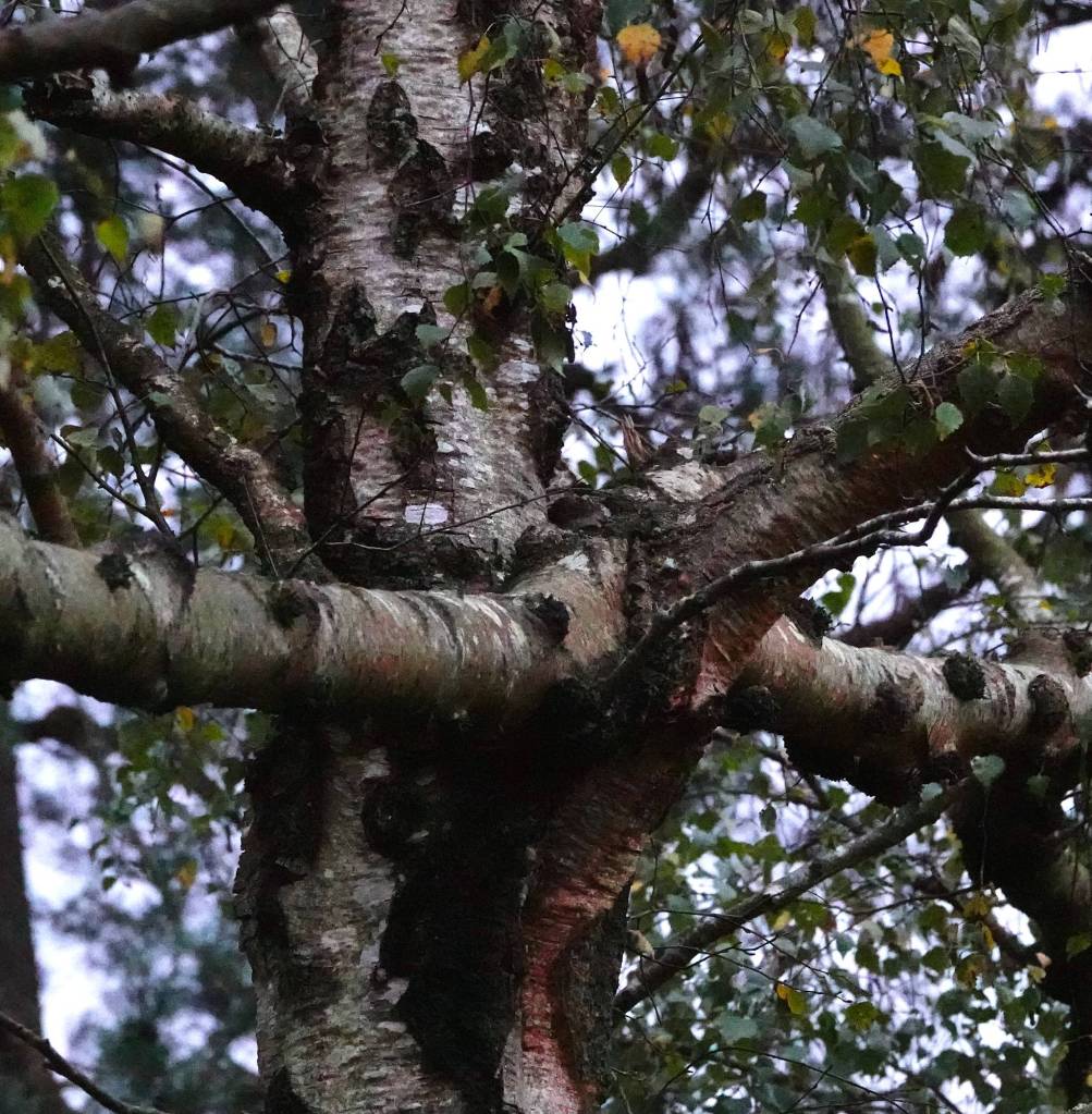 At the border of the wood, I spot a Birch, one branch of which has grown away horizontally from the main trunk, stretching out thinly before finally resting in the crook between trunk and bough of a neighbouring Birch. This second tree has accepted the questing branch, and the two have folded their bark together in mutually welcoming growth.