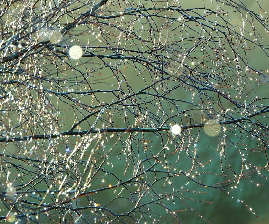 I walk across a footbridge over the Avon Water. A smattering of rain still sparkles as it hits the brook, circular ripples dancing on the surface. By the side of the track, raindrops cling to the bushes, gleaming in the brightening day.