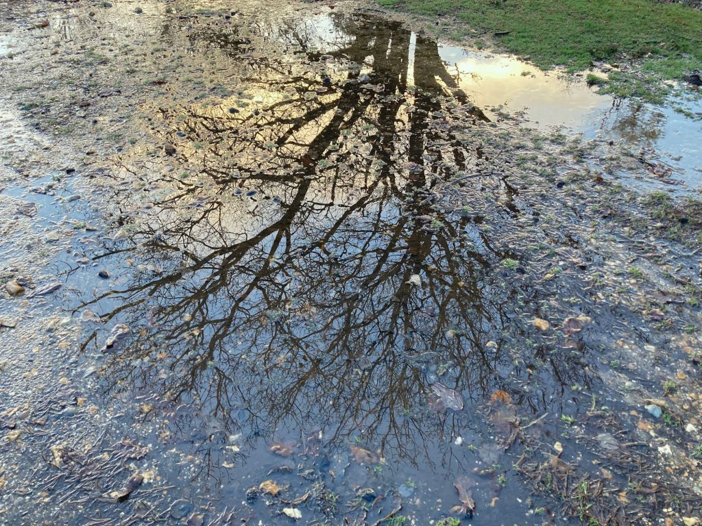 The old railway line goes straight south-eastwards from here, racing towards the A35. The sun is now almost out – the occasional ray gleams from behind a cloud or through the branches of a tree – and the rain has properly stopped. The track is sandy and gravelly, with some squelchy muddy patches and puddles reflecting the trees growing on the banks to either side, like portals to an upside-down world. Water runs cheerfully down the old embankments.