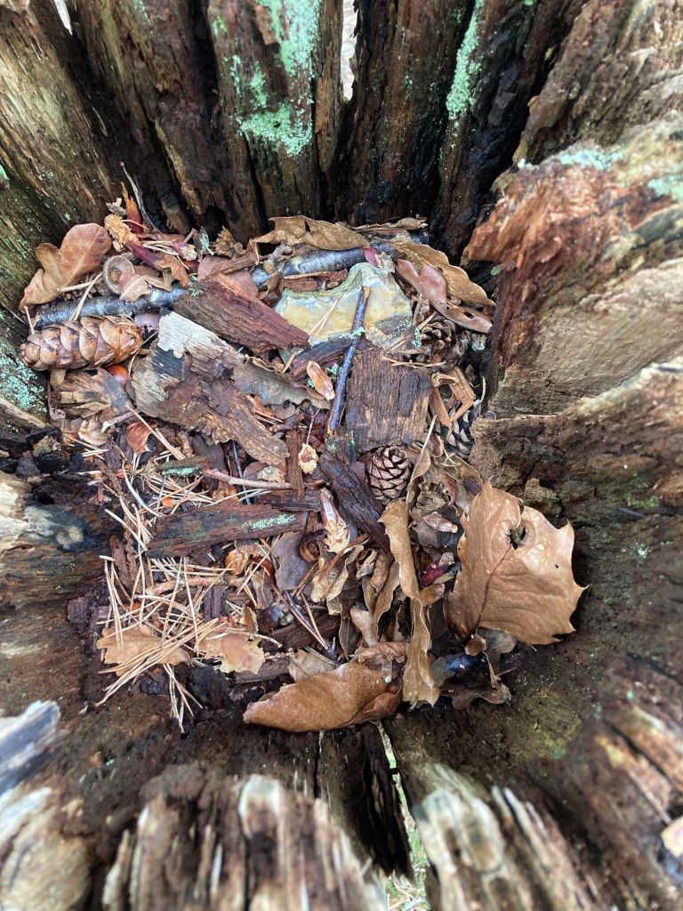 One of the first species of tree to recolonise Britain after the glaciers retreated some 10,000 years ago, birches are what are known as pioneer species. There are two native species in the UK – the Silver Birch and Downy Birch. I am not confident at distinguishing them, so haven’t tried, but I expect both can be found on Rockford Common. Both species are prolific in their production of wind-borne seeds, and this is why they can so easily colonise a landscape. Lovely as they are, this is not so good for lowland heathland, which is an internationally rare habitat: the New Forest heaths are important because they comprise 75% of the lowland heaths that still remain in Europe. Ponies don’t like to eat birch seedlings, so land managers – the National Trust in the case of Rockford Common – need to fell birch and other tree species in order to protect the heaths. We passed several tree stumps at the edge of the common, already being colonised by moss, fungi and lichen. It was interesting to see the cross-section of the trunk – the rings still visible through the saw marks, the central section of yellowish wood, and a darker ring just within the gnarled bark.