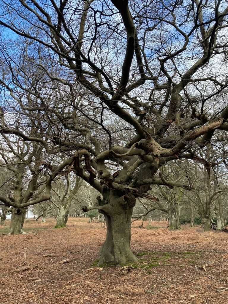 At the end of last week’s post, Joan, Bill, Mr. Bundy and I left you at the north-western corner of Ridley Wood, famous for its smugglers’ market of yesteryear and the stately beauty of its pollarded Beeches. This week, we are continuing our walk, turning eastwards across the plain and towards Berry Beeches, where we are promised examples of ingrowth (when branches fuse together making wonderful shapes and twists: it’s caused when the branches rub against each other in the wind, and as the bark wears away the branches can self-graft).