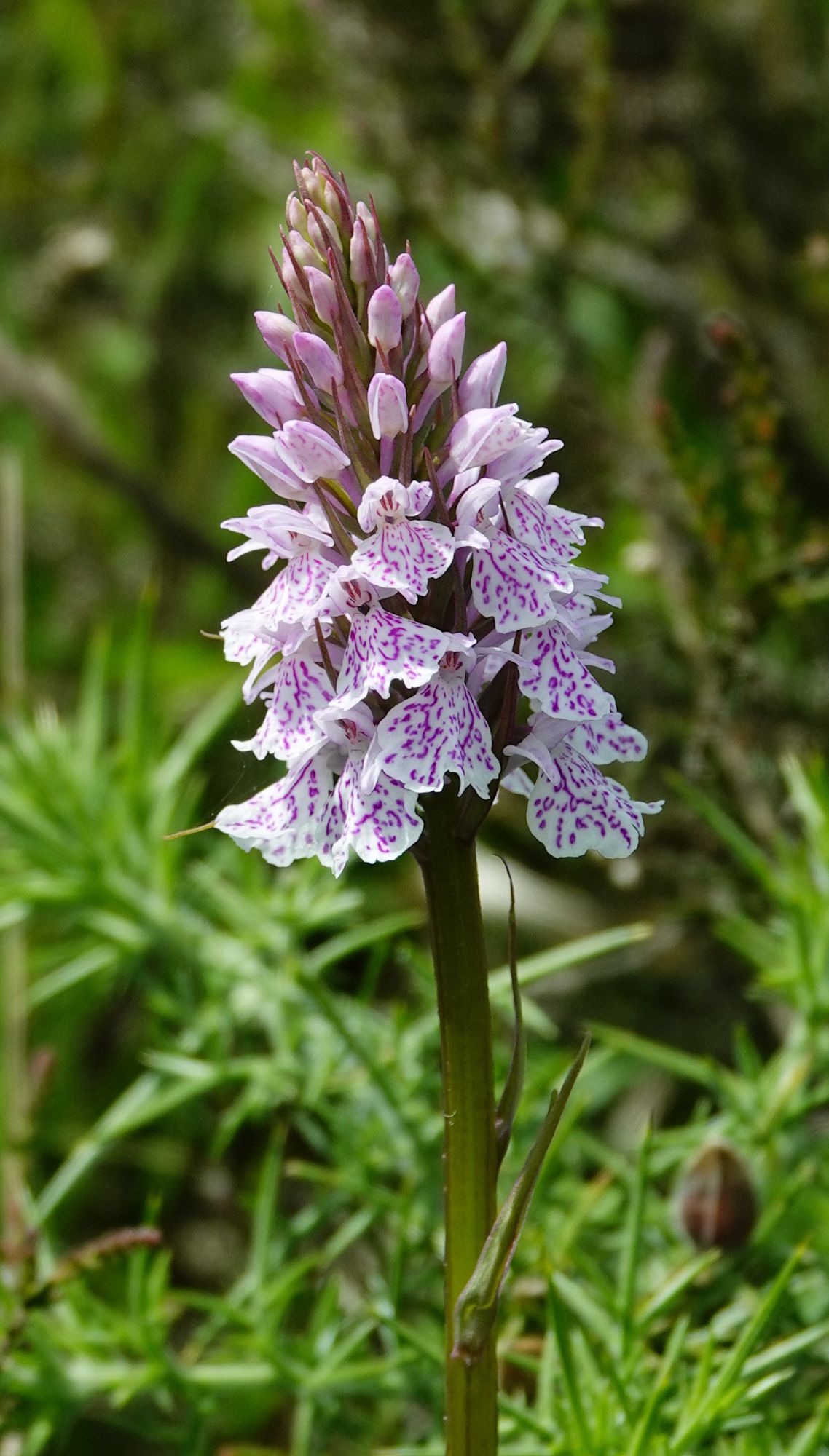It is getting very, very hot now, even though noon is still over an hour away. I trudge down the slope, cross Long Brook, and then trudge up the far slope. My flagging heart is lifted by Common-spotted Orchids (there’s nothing common about them) scattered among the heather and Sheep’s-sorrel. The vast blue of the sky helps, too. On the way uphill, I pass an old stone with some barely legible writing carved into it. It commemorates a man called Admiral Murray, who was killed hunting in 1901. The track is called Murray’s Passage, in his memory.