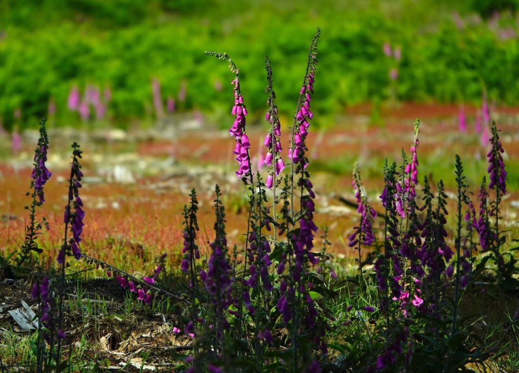 Foxgloves at the edge of Coneygeer Bottom in Highland Water Inclosure in the New Forest, against a tawny background of Sheep’s Sorrel glowing in the sunshine.