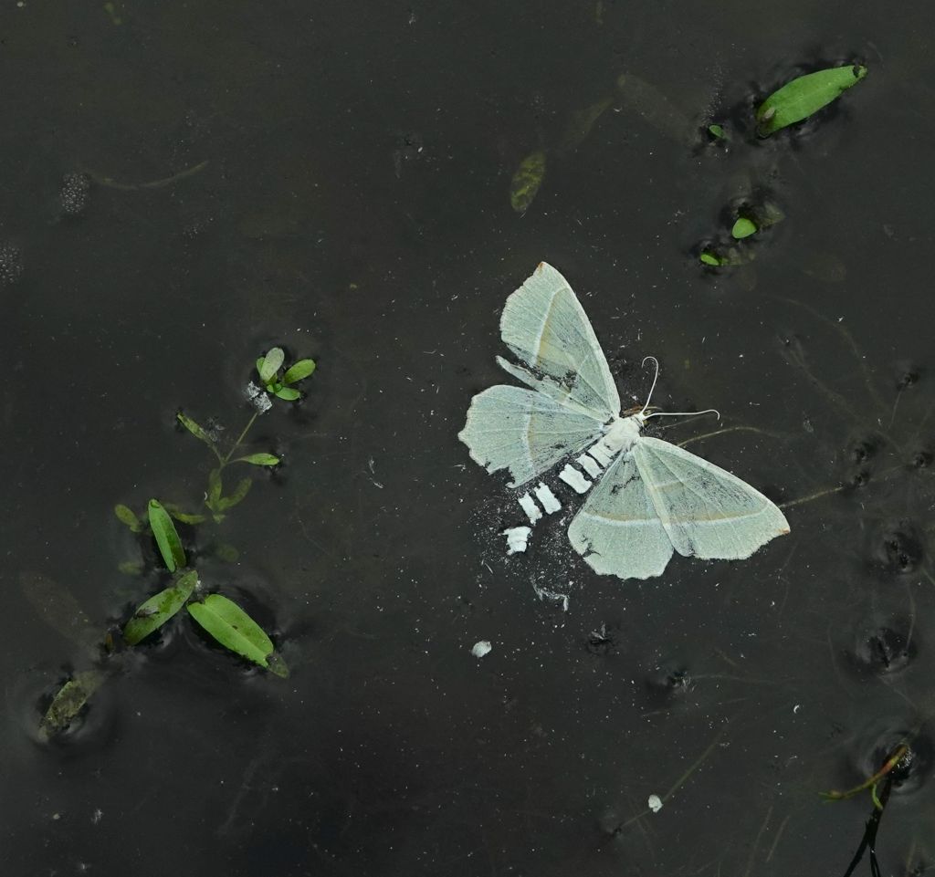 The drowned moth at the edge of Puckpits Inclosure. A friend has identified it for me as a Light Emerald.