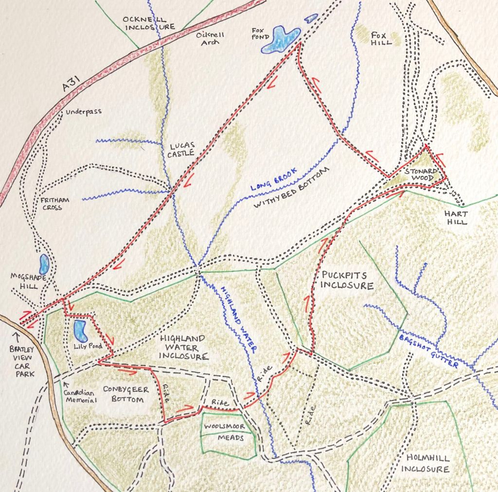 Highland Water Inclosure is large, and is itself part of a wider tract of continuous woodland inclosures, which together cover 1,713 ha. If you look at a map, you may be confused (as was I, at first) by the words Bolderwood Walk printed across the area of Highland Water Inclosure, especially if you then spot the same term running through Ocknell Inclosure, north of the A31. This is, in fact, an old administrative division of the New Forest: there were 15 walks in total, now used to refer to an area descriptively, but with no administrative purpose.