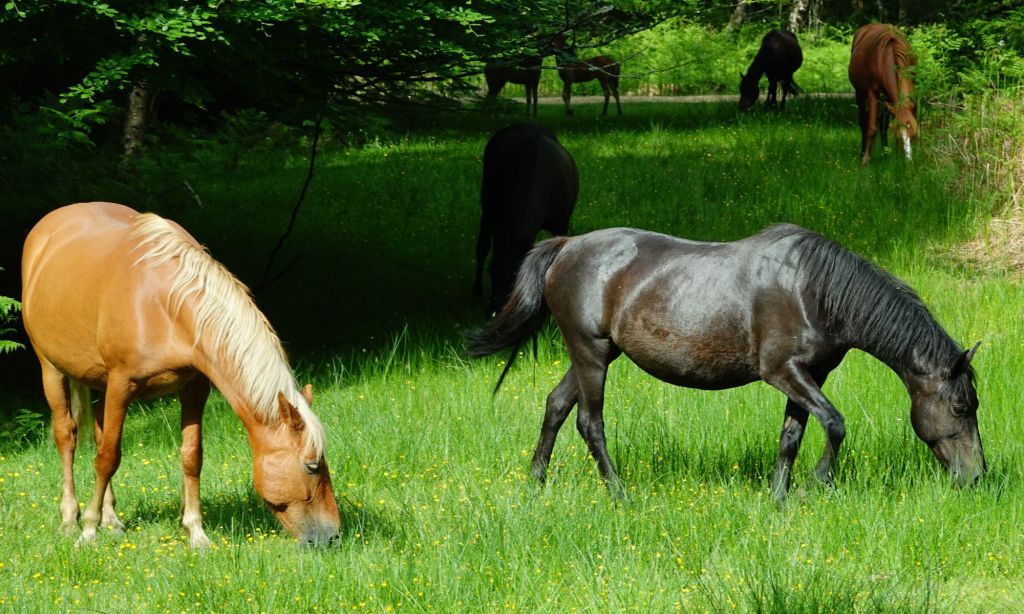 Joan, Bill and Mr Bundy join me, still fresh from their walk up through South and North Oakley Inclosures, and we make our way up to the top of Mogshade Hill. I visited this high spot with its views and hilltop pond back in March. This is one of the places in the Forest where ponies gather – called shades locally – and they are all gathering now, at the top, up and down the slope, swishing tails, grazing, occasionally nickering or nudging each other. Lots of Forest ponies already have their foals, but none here.