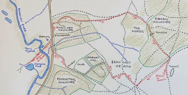 This week, we’re continuing our walk from King’s Hat and will now be making our way across Beaulieu Heath. (Joan describes her full walk on pages 189 to 202 of Walking in the New Forest, if you have a copy and want to follow her account.)