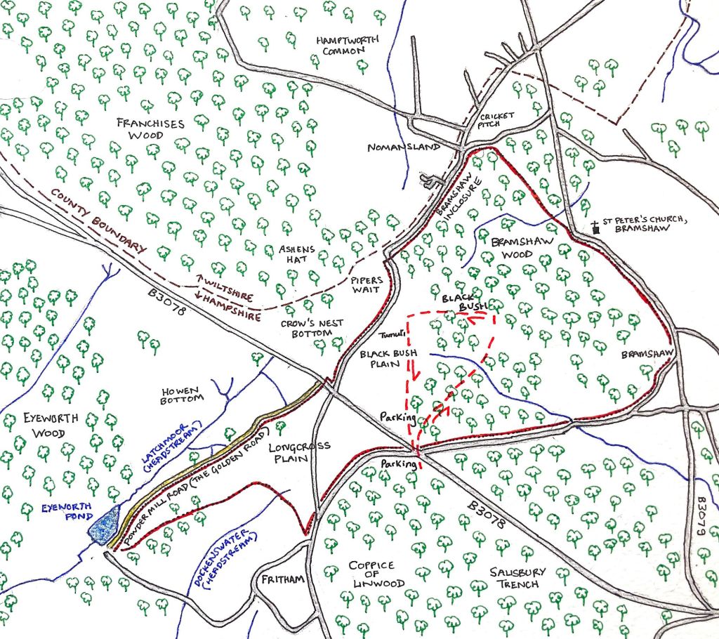 The part of the northern Forest around Pipers Wait and Black Bush Plain is amongst the highest in the area: indeed, at 129 m above sea level, Pipers Wait is the highest point in the New Forest. It feels it. Driving along the B3078 from Fordingbridge towards the crossroads with the Fritham/Nomansland road, the plain stretches to left and right, ahead and behind. It’s now tinged with the purple of heather, though I feel it’s not yet at its full glory – if indeed it can reach it after the effects of the scorching summer on the blossom.