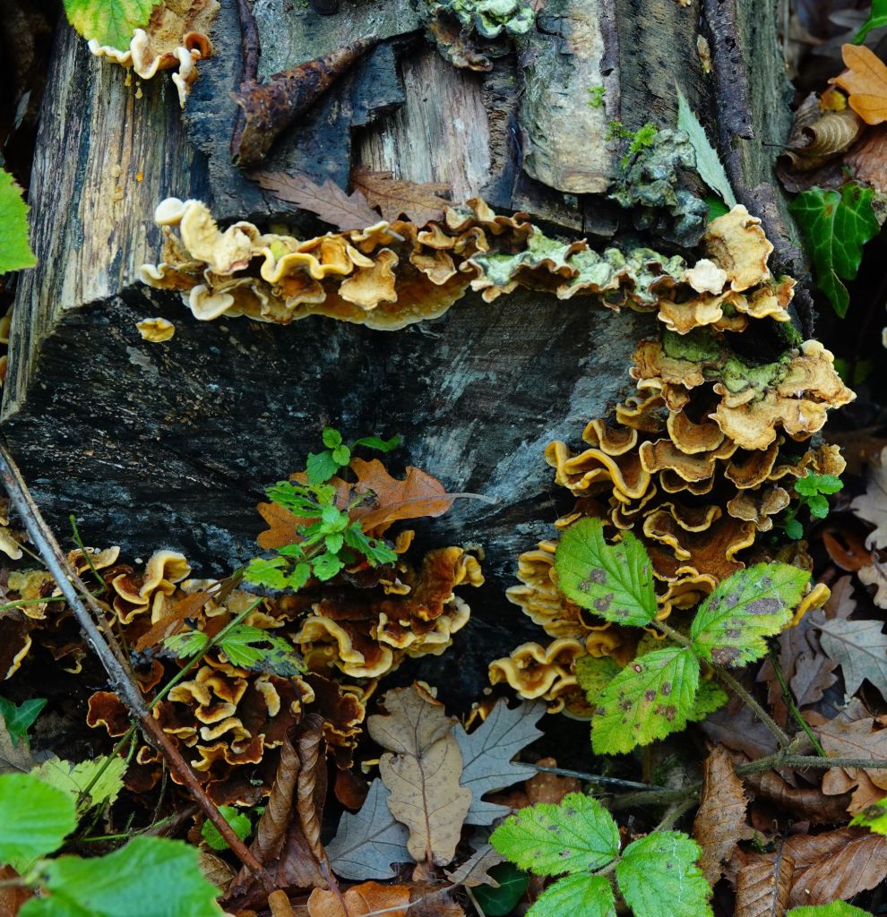 There are indeed plenty of fungi. I am not much good at fungi identification, but I find what I am fairly sure is Hairy Curtain Crust, and then, on a fallen Oak, rows of Black Bulgar (sometimes called Rubber Buttons – they are indeed rubbery to the touch). (Apologies in advance if I am wrong on the identification – I’m extremely happy to be corrected!)