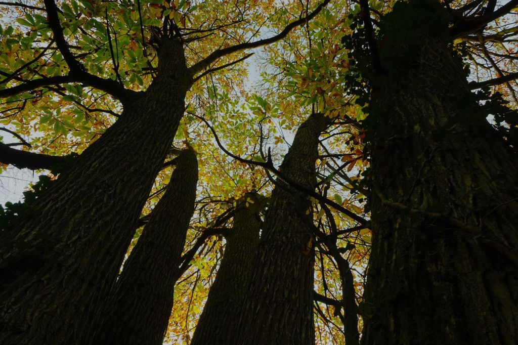 A little past the fungi, I find an old friend. By the side of the path grows a wonderful Sweet Chestnut, that must have been coppiced in its past. From fairly low to the ground, the tree divides itself into five trunks, each broad enough to be trees in their own right. Did Joan pass by the five-trunked Sweet Chestnut, back in the 1930s? Sweet Chestnuts can live for a several hundred years, so I imagine her pausing to greet this tree, placing her hand on its bark, just as I am doing now, a ghost of her fingers beneath my own. The tree knows, but it’s keeping its secrets.