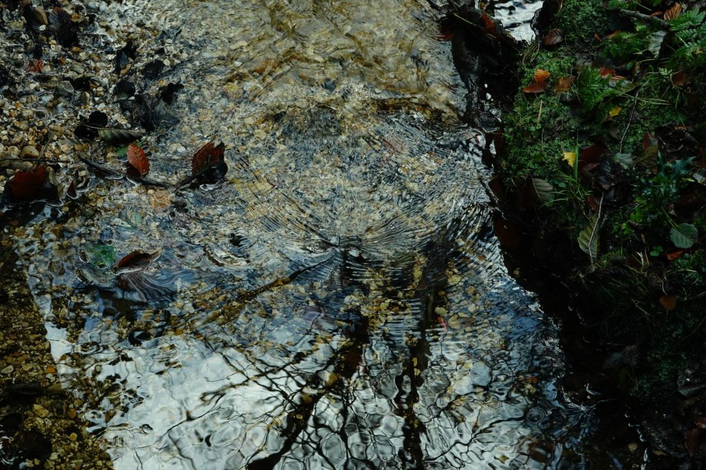 What else did I find? Bilberry, or whortleberry as Joan names it, readying itself for bursting into new life next spring; a bracket fungus crowned with golden beech leaves; and repeating patterns on the water of the brook I crossed over a little wooden bridge.